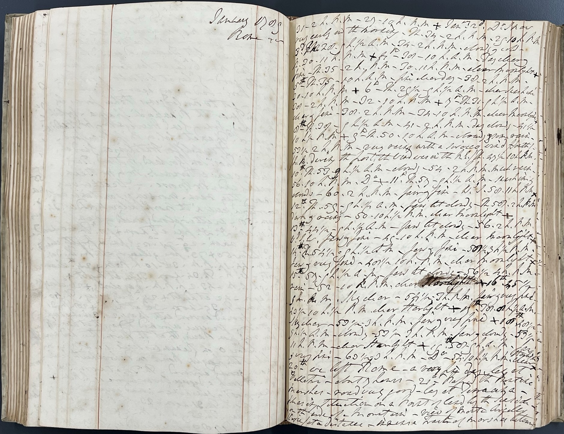 Of his road journey south to Naples, Danby describes the landscape through which he travels, commenting on the views of Mount Vesuvius and the Bay of Naples, noting that the January weather was “very fine and almost as warm as summer.” For his journal, he has used a large, pre-printed ledger book, similar to that used by Thomas Orde in 1772, although only writing on the right hand page. On the spine of this book, is written ‘TRAV MEM’.