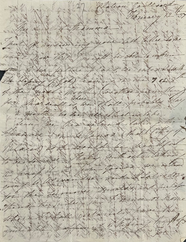 Mrs Fanny Fuller’s correspondence with her mother, Mrs Bagot Armstrong, in Ballycumber, Ireland illustrates the travelling life of an Army officer’s family in the early-19th-century. As the wife of Abraham Fuller, an officer with the Irish Army, Fanny travelled with her husband and children in France, Germany and Italy. In this criss-cross-written letter from Chateau Gaillard to her mother, she talks about the family’s future plans, going the next month to Marseilles where they intend to stay for one month, then on to Genoa, Alexandria and San Salvadore for the summer. Afterwards, she writes that they might “spend the winter in Florence or Rome, where I shall certainly have the enviable happiness of kissing the Pope’s toe.”
