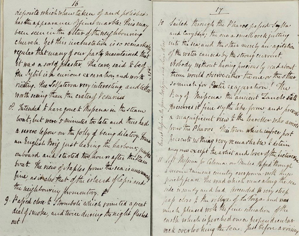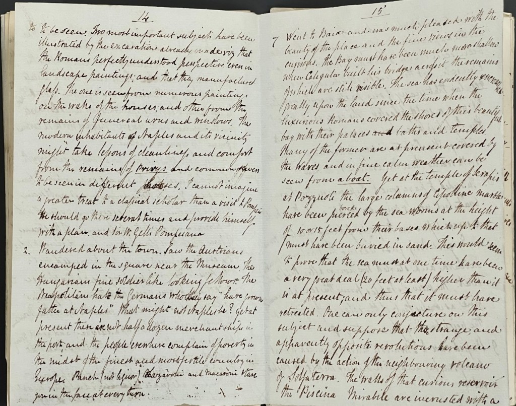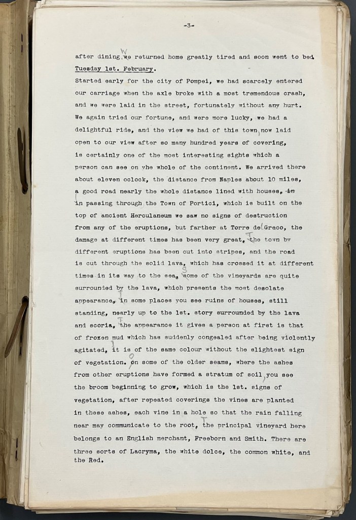 We do not know who typed the above manuscript, or when. The typewriter was not in common use in 1825, so we presume these pages were typed at a later date using J.S. Crompton’s original notes. The typescript starts with a detailed description of an ascent of Vesuvius and a visit to Pompeii.
