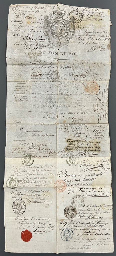By the 18th century, French was commonly referred to as the language of Europe, being used in commercial and diplomatic papers, such as passports issued in London. This passport, printed on thin paper, has multiple stamps, including those from Florence, Rome and Naples.