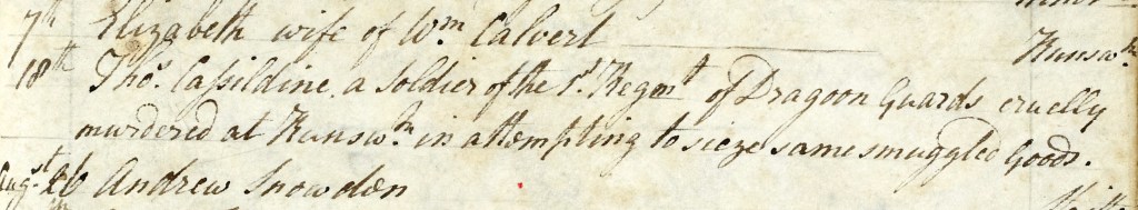Burial registers also shed light upon the battle between smugglers and the state during the eighteenth century, when smuggling was rife on the North Yorkshire Coast. In 1769, the registers of Hinderwell record the burial of John Carr of Sunderland who was shot by a king’s cutter aboard a Smuggler and in 1776 Thomas Cassildine a soldier of the 1st Regiment of Dragoon Guards “cruelly murdered at Runswick in attempting to seize some smuggled goods”.
