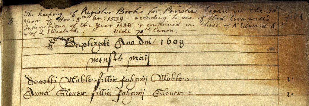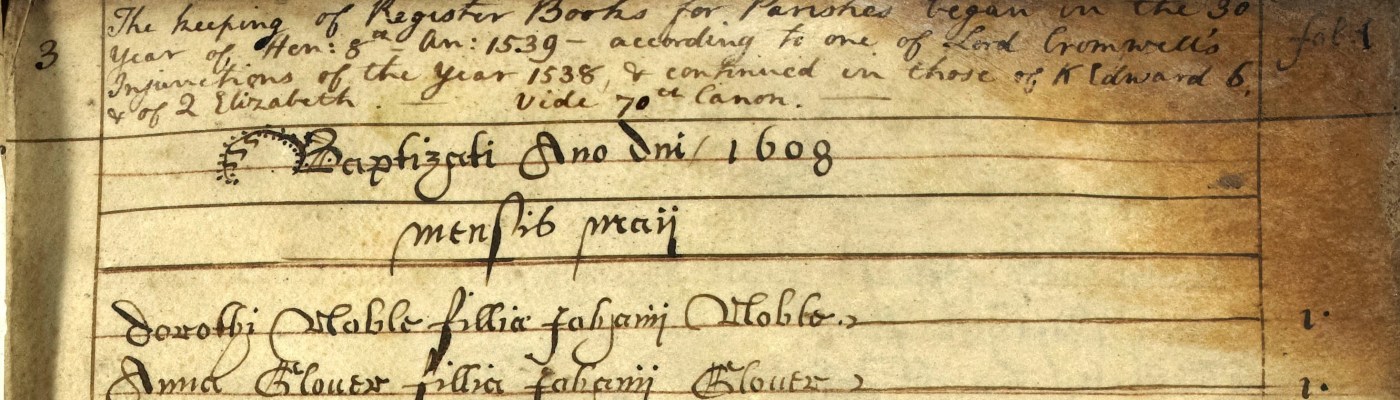 The earliest surviving parish register from St Mary’s church in Whitby begins in 1608. The register is in Latin which remained the language for many official documents until 1733. The earliest baptism entries name just the child and the father, the first entry being Dorothy Noble daughter of John Noble (Dorothi Noble filia Johanis Noble) on the 1st May 1608.