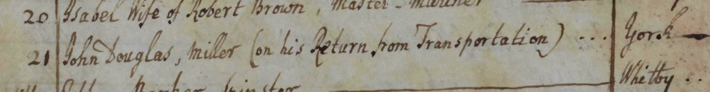 Burial registers sometimes include additional information as to the circumstances of unusual deaths. On 6th November 1705 William Stonehous, a Whitby man, was buried at St Mary’s after falling down during the Sunday church service. On 21st May 1761 John Douglas of York, a miller, was buried at Whitby having returned from Transportation. Miller had presumably been transported to America and for a period of penal servitude (usually 7 years) only to die on the very last part of his journey home.