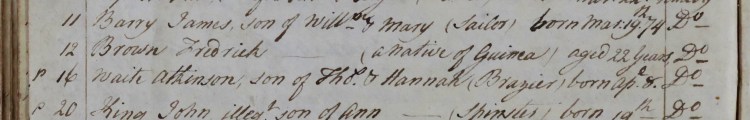 Newcomers to the parish appear in the registers too, such as the baptism at St Mary’s of Fredrick Brown, a native of Guinea, on 12th April 1775 aged 22.