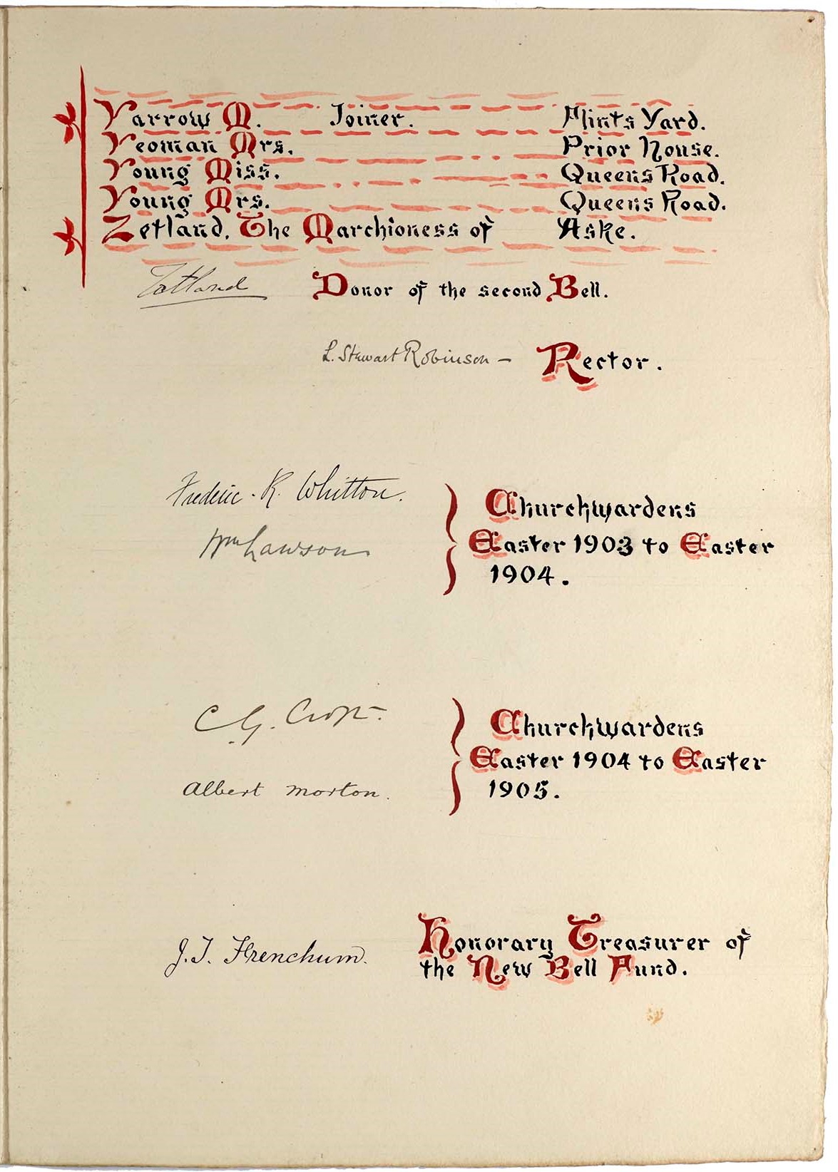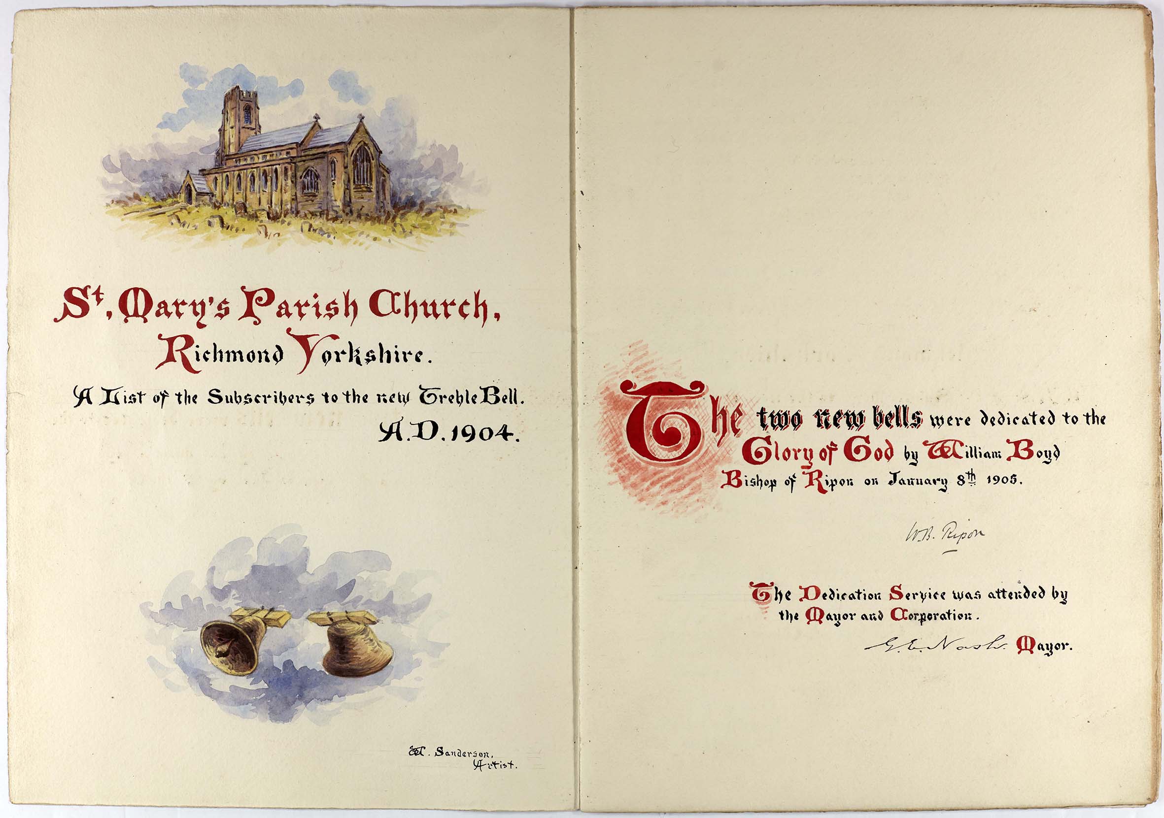 The parish records also include faculties, which record work carried out on the church building. This colourful booklet contains the names of those who subscribed towards the cost of purchasing a new church bell in 1904 (PR/RM 9/1/33.