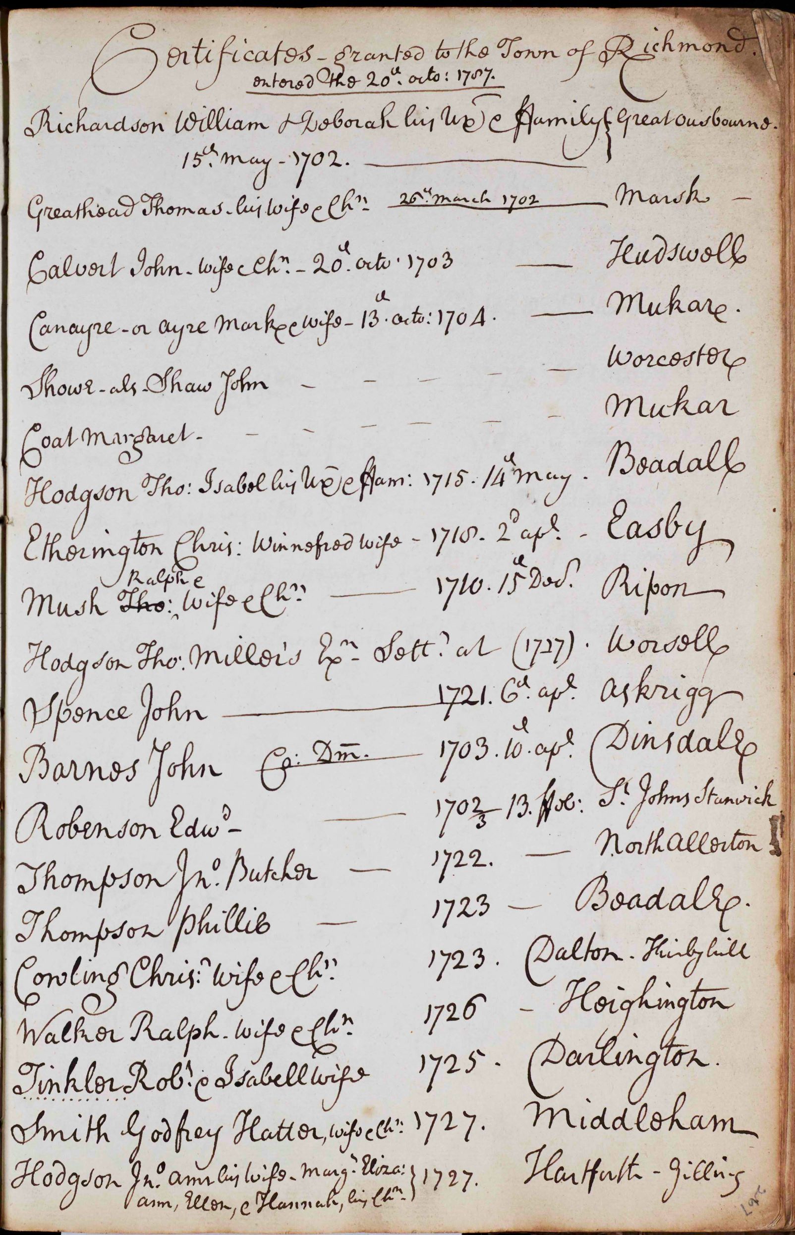 At the back of the book is a list of what appear to be settlement certificates granted between 1702 and 1787. Each entry names the person, the parish from which they came and the year.