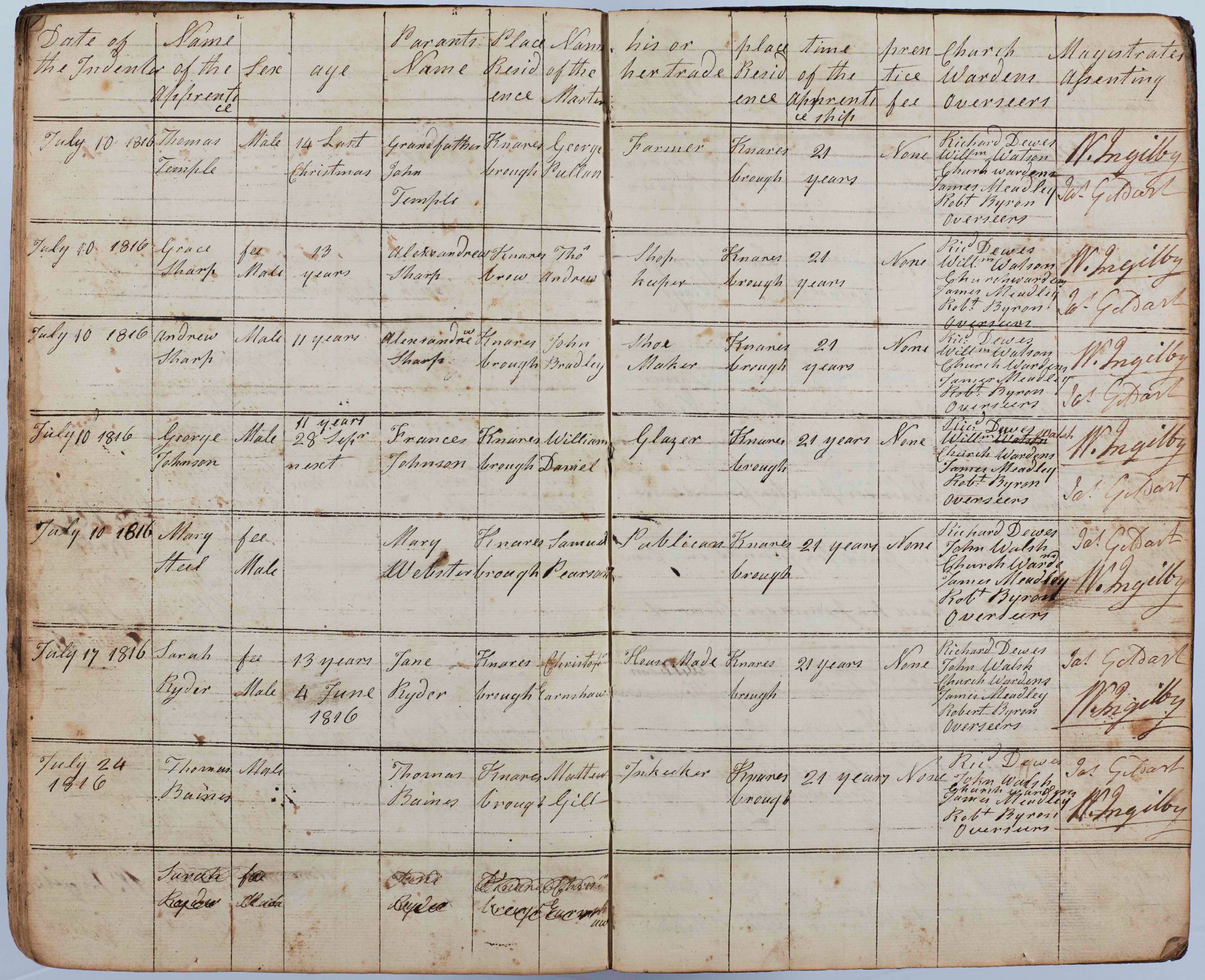 A register of apprentices for Knaresborough (1794-1835) contains basic personal details of both the children and their new masters, together with the names of the churchwardens and Overseers involved in the forming the agreement.