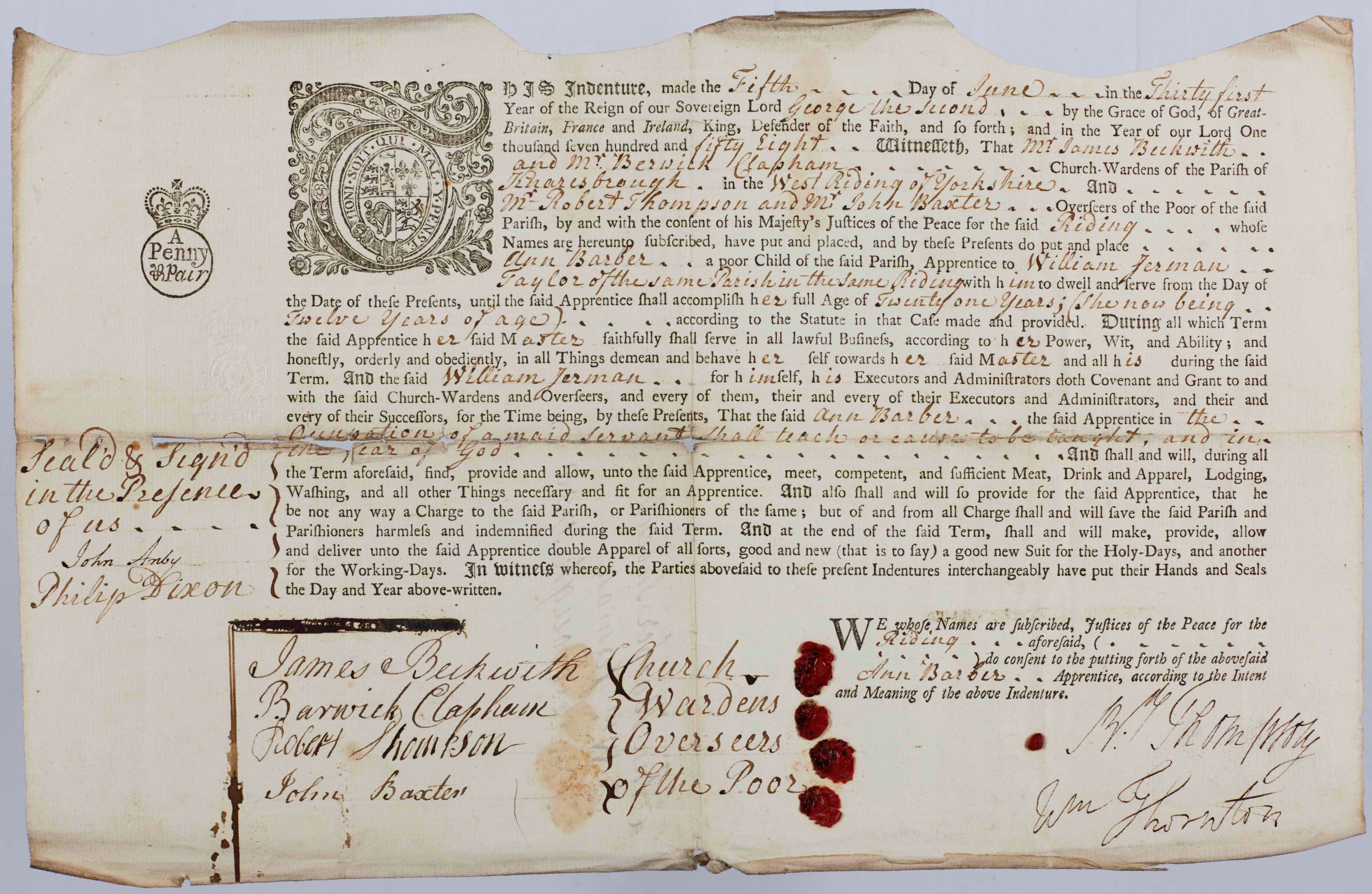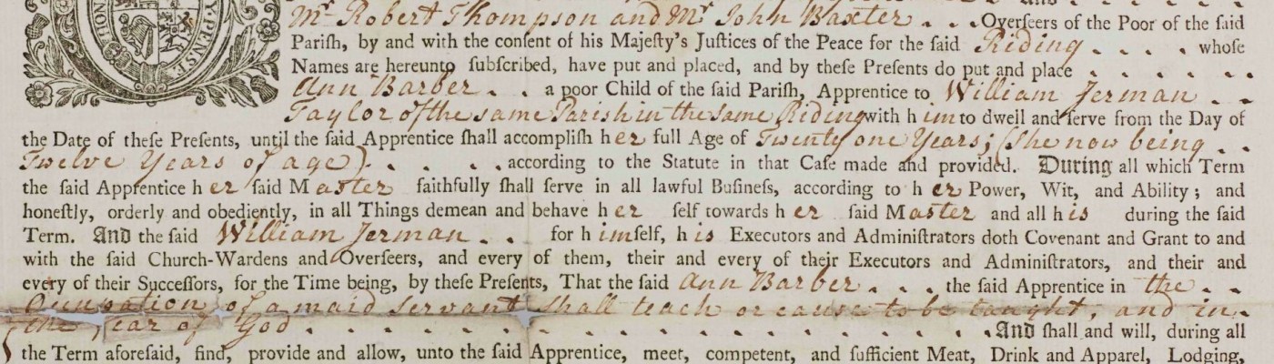 Some original apprenticeship indentures, setting out the full terms of the agreement between apprentice and master, survive for the years 1758-1845 – like this one for Ann Barber, aged 12, who was apprenticed to tailor William Jerman in 1758, until she reached the age of 21.