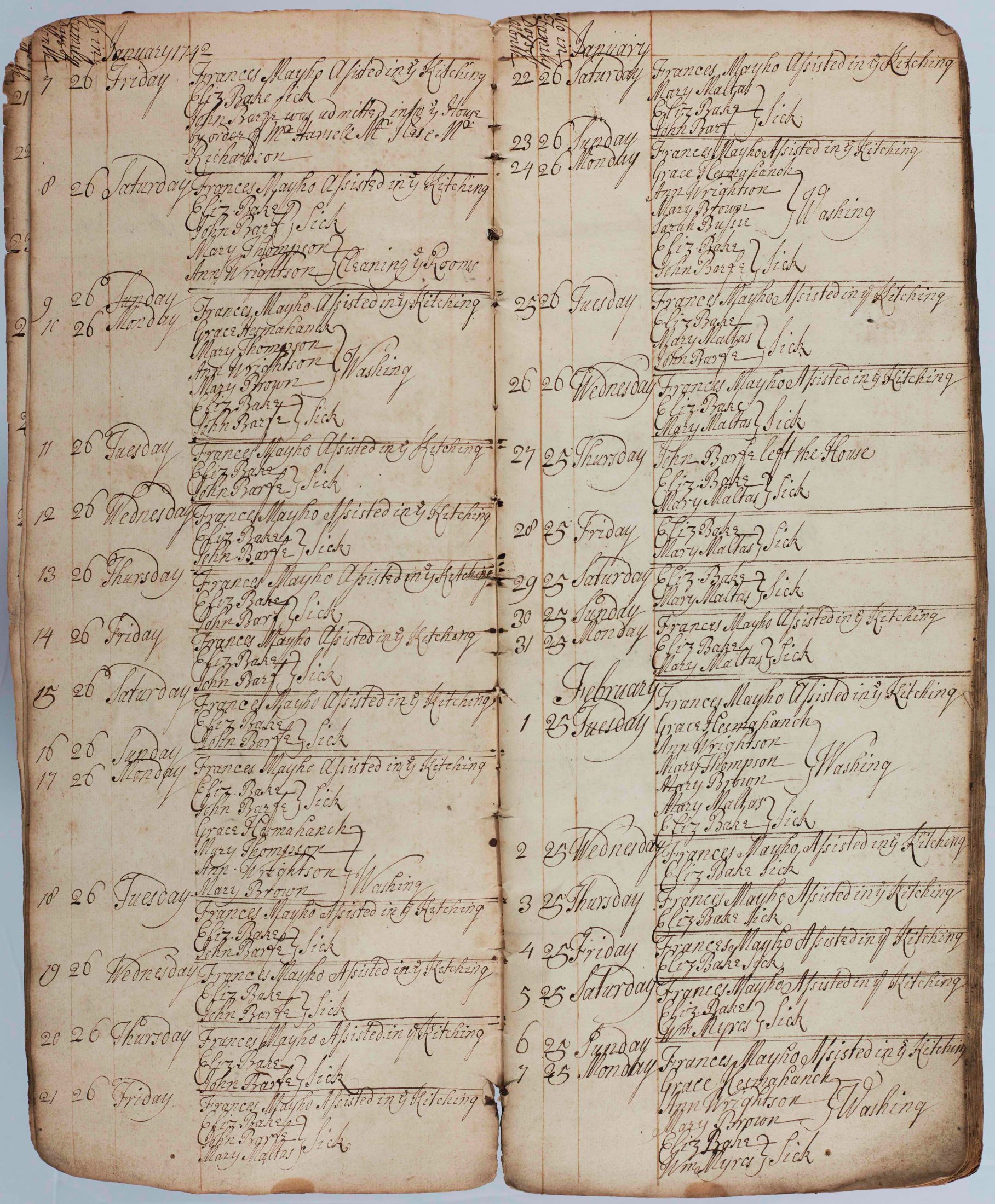 Amongst the workhouse records are two books containing a record of work done by occupants, which provide a fascinating glimpse into a few lives during the 1700s. The first (1742-46) is a daily account of work done in the house itself – mainly washing and kitchen duties, carried out by the women – together with a daily tally of all occupants. The names of those who are sick, or who leave the workhouse are also recorded.