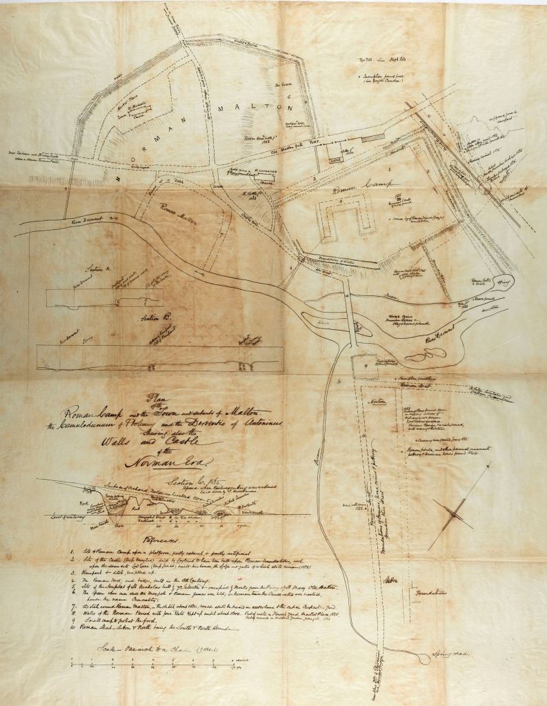 This collection of papers in the County Record Office is a rare and important survival from the 19th century. They are of interest in themselves for the information they contain, and what this can tell us about the history and nationally important archaeology of Malton and Norton. Orchard Field Roman fort, the sites of the castle and St Mary’s Priory are all designated as scheduled monuments.