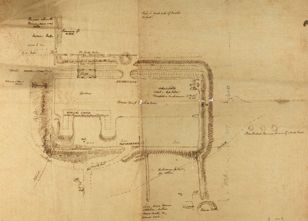 I was excited to discover that not only are there handwritten notes and drafts of lectures on the history of Malton and St Mary’s Priory, Old Malton, but also a notebook containing sketches of Roman finds from the town and surrounding areas. It was this notebook that particularly interested me, as well as two hand-drawn plans of the area around The Lodge and Orchard Field, where the earthwork remains of the former Roman fort and vicus (civilian settlement), and later medieval castle survive.