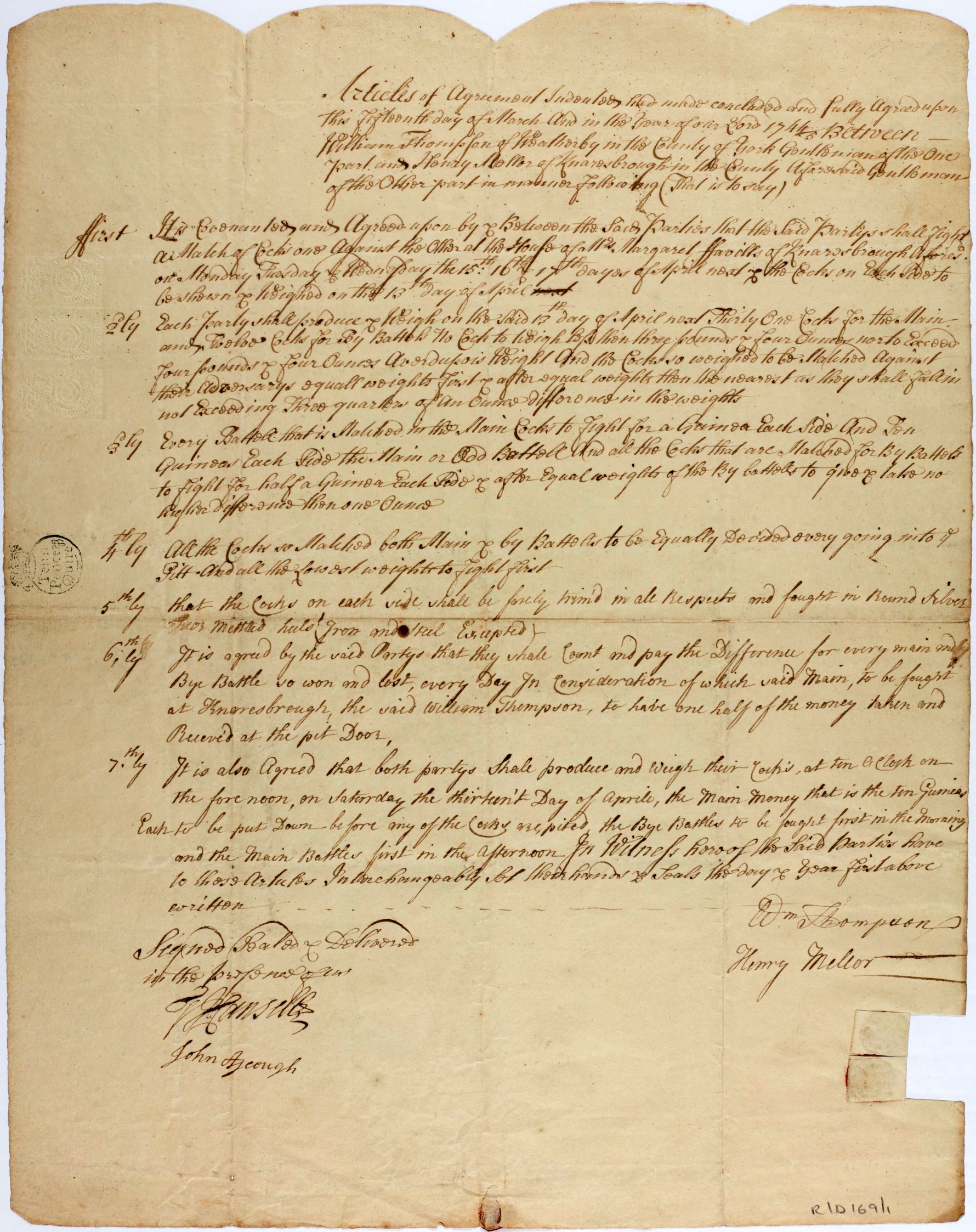 Cockfighting agreement & list of gamecocks (Z.1484)