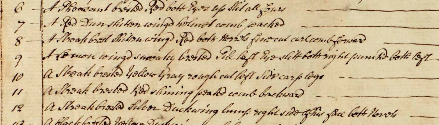 The second document, dated 9th June 1747, lists fighting cocks under the names of their two owners. Each bird is described in great detail, including plumage (“lemon winged, smoaky brested”), any distinguishing marks or disfigurements, condition of claws and beak and crucially its weight. The first owner listed is Mr Miles Warde or Wade (some slight damage or decay near the surname), whilst the second, interestingly, is “Sir John Kay” – possibly, Sir John Lister Kaye, 4th Baronet, the Tory MP and later Lord Mayor of York (1697-1752). Each man has 52 birds to his name.