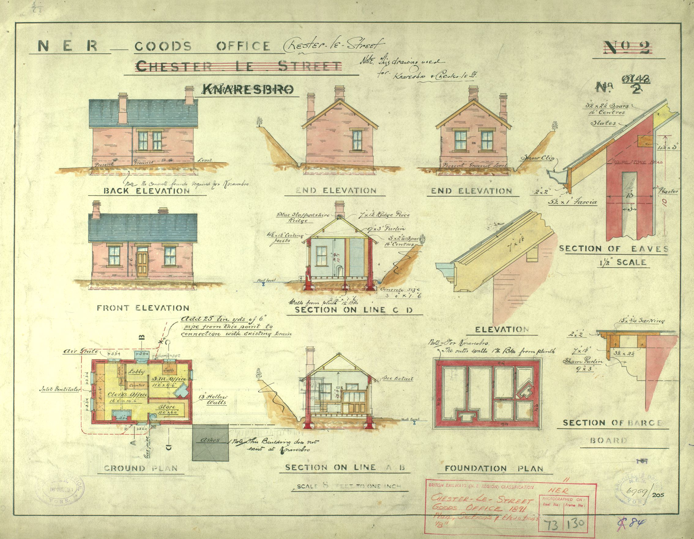Our holdings of plans of railway lines and buildings (ref: NG/RY) include this colourful North Eastern Railway plan showing the proposed goods office at Knaresborough, 1881. The station and its buildings were improved by re-building in 1891, and notes jotted on this plan state the designs were also used at Chester-le-Street station.
