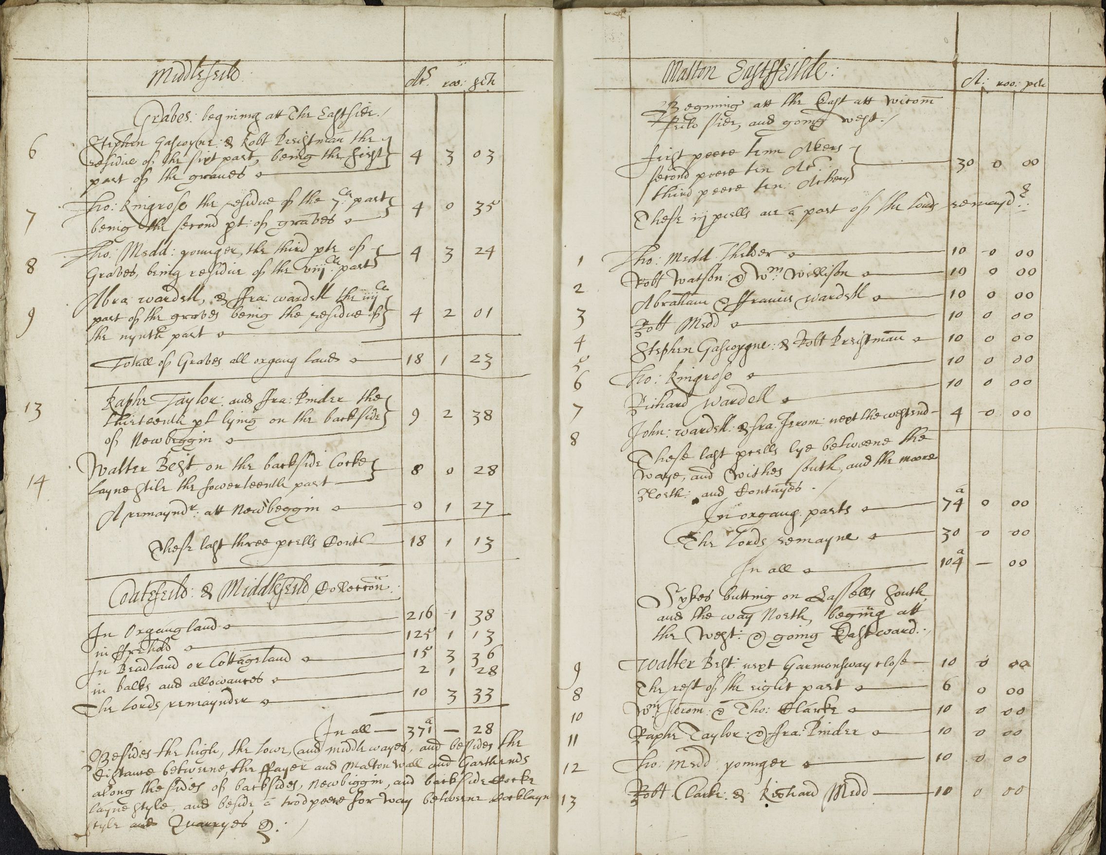 One of the earlier items within the estate records is a 1625-6 survey of Malton, Welham and Easthorpe Park by Salomon Swale. This handwritten book contains information on the names of those associated with various pieces of land, described as furlongs and oxgangs, with the respective measurements of area recorded in acres, roods and perches.
