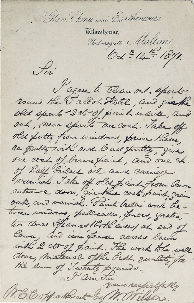 William Copperthwaite, agent for the Fitzwilliam Estate in the second half of the 19th century, appears in much of the correspondence within the archive, as does his predecessor William Allen. Here we can see a letter to William Copperthwaite from Mr Wilson of the Glass, China and Earthenware Warehouse, Yorksersgate, Malton, dated 14th October 1871. This concerns works to the Talbot Hotel, including cleaning out of the spouts and the painting of doors and windows, all for the sum of twenty pounds.