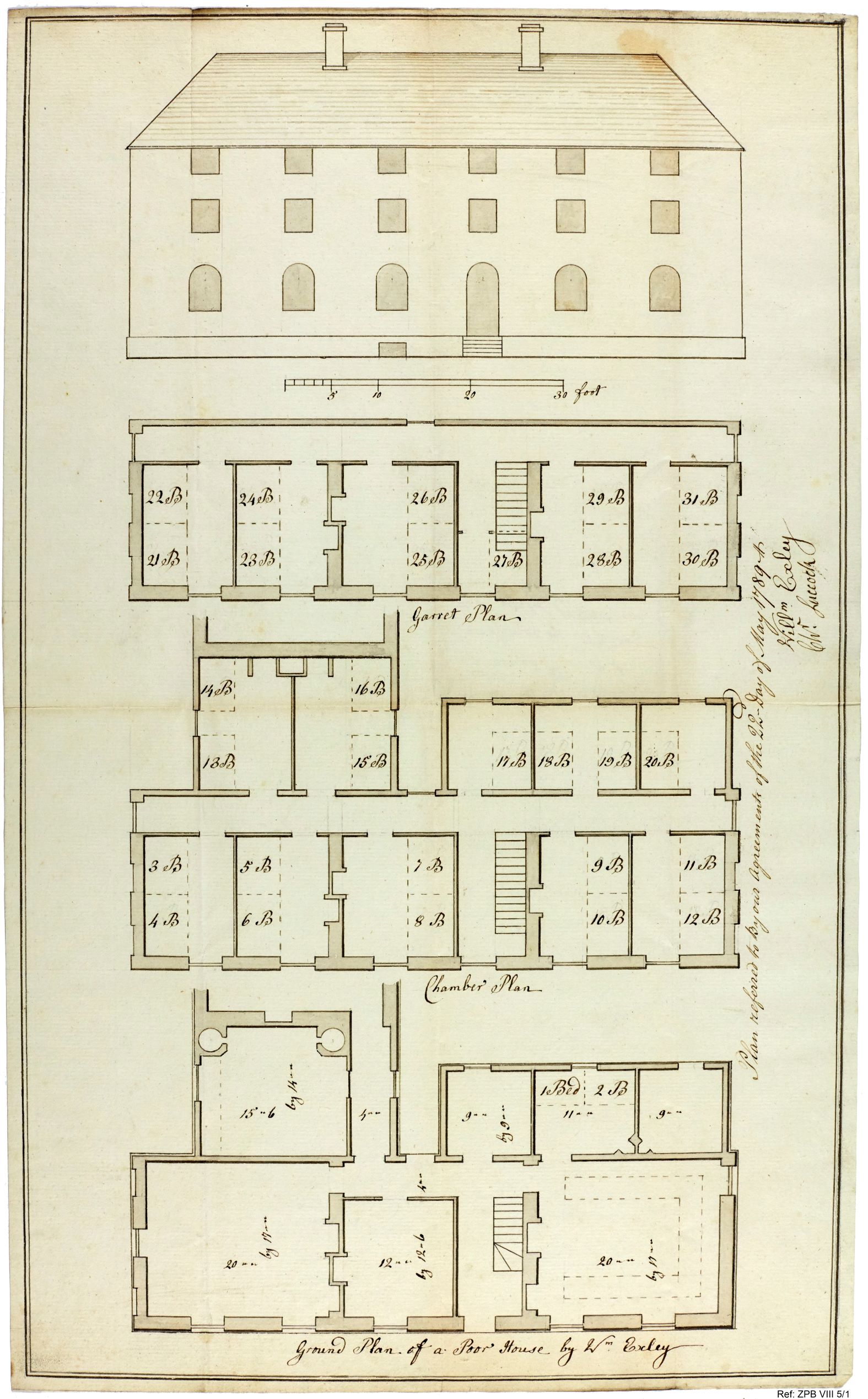 Image right: ZPB VIII 5/1 Ground Plan of a Poor House, Malton by William Exley, approved 22 May 1789