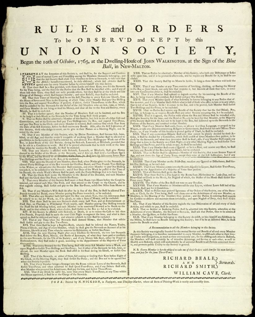 One of these organisations, the Union Society, was “begun the 10th October 1765 at the dwelling house of John Walkington at the sign of the Blue Ball in New Malton”. Their first rule: “That the Intention of this Society is, and shall be, for the Support and Continuance of mutual Love and Friendship among the Members thereunto belonging”.