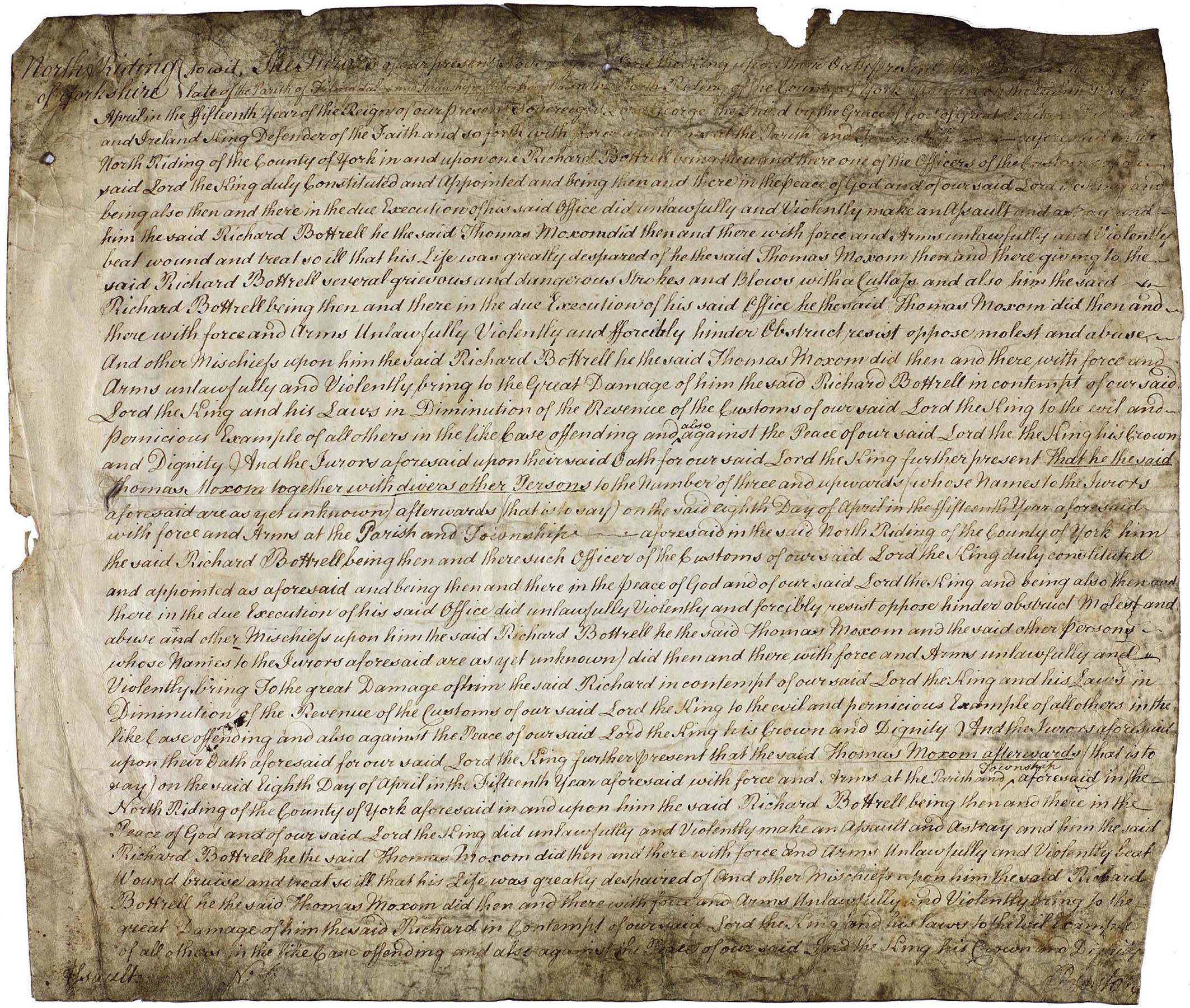 An indictment for Thomas Moxom, in the Quarter Session’ bundle for 1775, relates in detail Thomas’s attack on Richard Bottrell, a Customs’ Officer on duty in Robin Hood’s Bay on 8th April 1775. It states that Thomas, with “force of arms” did “unlawfully and violently beat wound and treat so ill that his (Richard’s) life was greatly despaired of” – Thomas landing “several grievous and dangerous strokes and blows with a cutlass”.