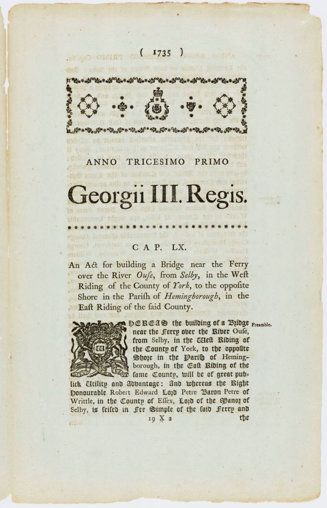 Until it was rebuilt in 1970, the original Selby Toll Bridge was reputed to be the oldest surviving timber bridge in the country. Following the passing of an Act in 1790, during the reign of George III, the swing bridge was built across the River Ouse in 1791 – a short distance downriver from the existing ferry service. The Act’s preamble states the bridge “will be of great publick utility and advantage” [Local Act of Parliament 31 Geo III c.lx].