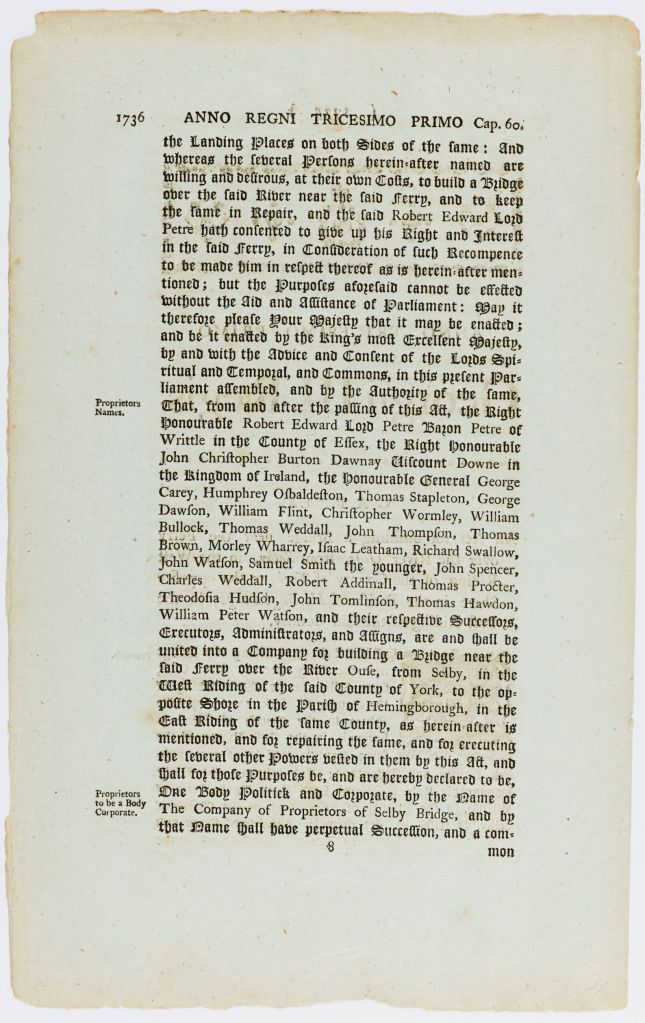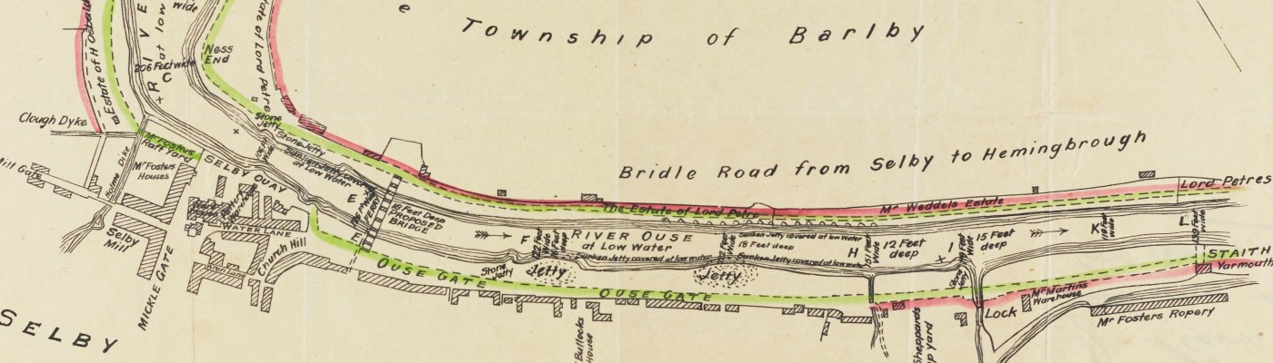 Twenty-four men, and one woman together formed The Company of Proprietors of Selby Bridge, financing the bridge using personal contributions and other raised funds. Heading the list was the Lord of the Manor of Selby, Lord Petre of Essex, who also consented to relinquish his interest in the ferry. Other members included local landowners or businessmen with town or river connections, whilst Theodosia Hudson was a woman of means from Brayton, having family connections to proprietor Humphrey Osbaldeston. Many of their names feature on the survey plan of the River Ouse at Selby, shown below: