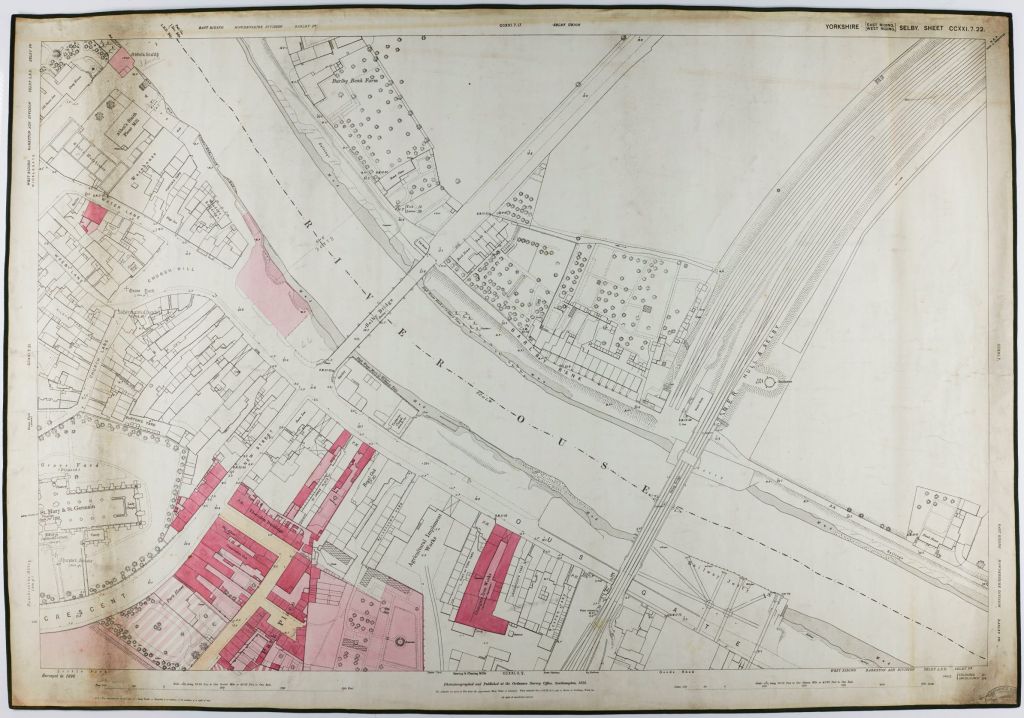 Amongst our holdings for Selby District Council [DC/SBR], is an 1891 edition 1:500 scale (10.5ft to 1 mile) Ordnance Survey map (Sheet 221) of the River Ouse at Selby. This incredibly detailed map shows the century-old toll bridge (marked as ‘swing’) and the historic site of the ferry crossing. The toll house on Barlby Bank is clearly marked, whilst on the Selby riverside can be seen the “conveniences” for travellers: the smithy and nearby public houses and an inn. Notably, the river is now also crossed by the North Eastern Railway Hull and Selby line (built in 1840), by means of a bascule bridge (a type of swing bridge utilising counterbalance).