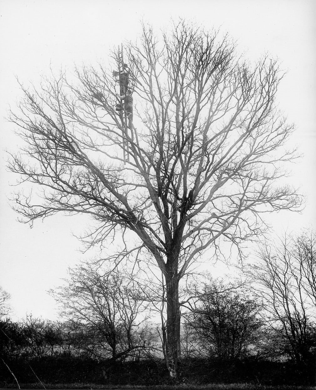 Right: The Kearton brothers with a ladder up a tree, another of the risky techniques they used to capture photographs of birds.