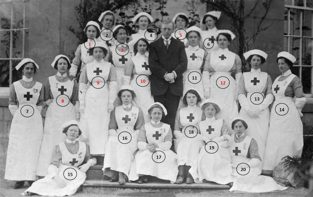 The nurses highlighted with a black number have been identified as follows: No. 2: Miss Elizabeth Ewbank, No. 4: Miss Barbara Alice Bell – later Mrs. Peacock, No. 6: Miss May/Mary Heseltine – later Mrs. Shepherd (USA), No. 7: Miss Ethel Johnson – later Mrs. Scott, No. 11: Mrs. Margaret Ann Dinsdale, No.13: Mrs. Annie Graham, No. 14: Mrs. Constance Emma Archer, No. 15: Miss Lily Wray, No.16: Miss Alice Scott – later Mrs. Mason, No. 17: Miss Gertrude Adelaide Tunstill – later Mrs. Pickles, No.18: Miss Kathleen North – later Mrs. Sayer No. 19: Miss Alice Ecroyd Tunstill and No. 20: Miss Madge Blades.