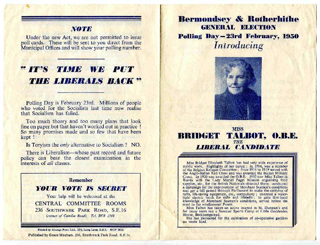 In 1931 Bridget joined the National Labour Party. Later she ran in elections as a Liberal candidate for Bermondsey in 1950, and as an independent candidate for Richmond in the 1964 general election.