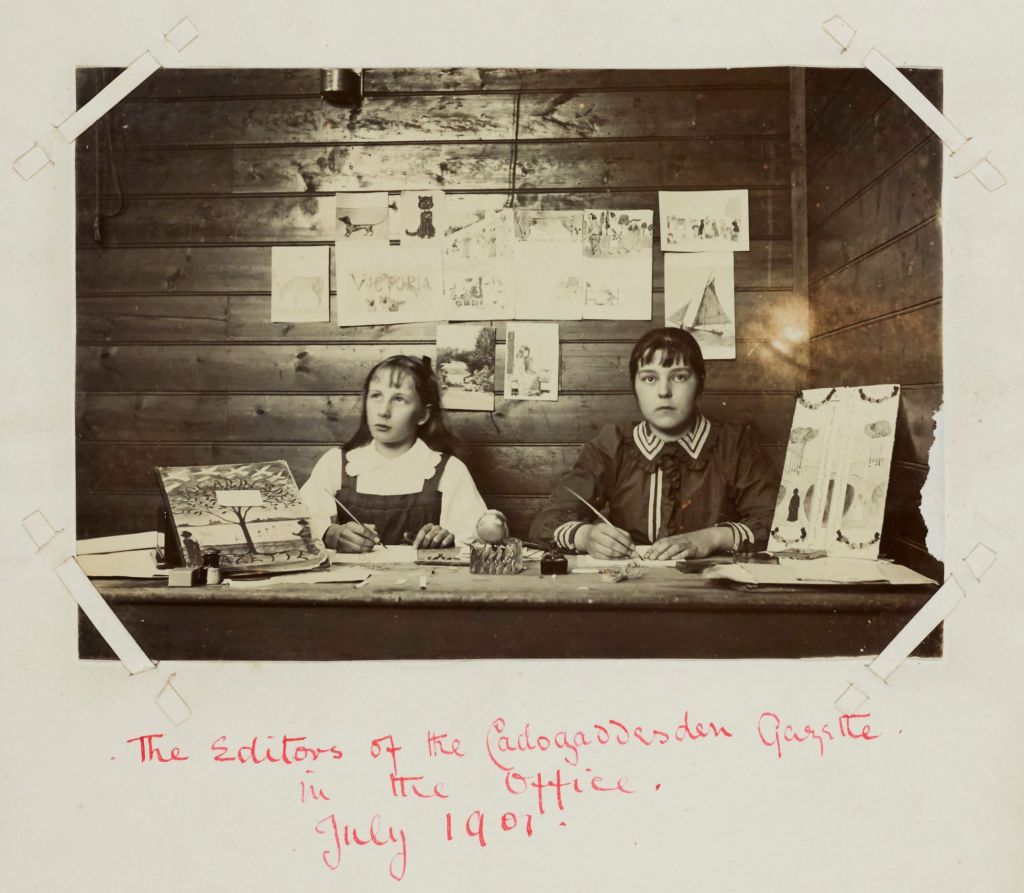 Bottom: ZBL The Editors of the Cadogaddesden Gazette in the Office. July 1901 – showing Bridget Talbot and Constance Lane, with items from previous numbers pinned to the wall and on the desk.