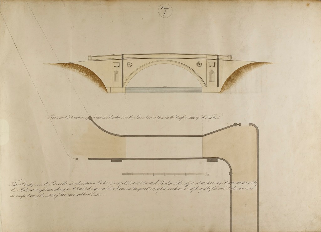Carr recorded his plans and repairs of bridges in the North Riding in an annual report which he would present to the Quarter Sessions. The Record Office holds Carr’s ‘Book of Bridges’ from c.1805 which includes plans and elevations for over 85 bridges in the North Riding (Ref: QAB(P)). The first bridge Carr designed was at Masham in North Yorkshire and the last at Ferrybridge in West Yorkshire. His bridge designs were primarily classical, with rounded arches, and built as features of the landscape.