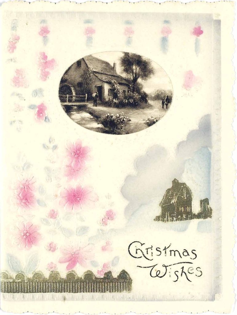 The largest number of Christmas cards pertaining to one collection is within the correspondence to and from Flora Howdle, dated 1900-1915. These papers (which include postcards, cards, letters and a notebook) are a deposit within the “Other Bodies” records of Harrogate Borough Council [DC/HRG XXIII 29/3]. Flora worked as a nurse at Menston Hospital from 1900-1920, and thus during the years of the Great War. Menston Hospital was then High Royd’s Asylum – the pauper lunatic asylum near Leeds, changing its name to Menston Mental Hospital during the 1920s. The eight cards in Flora’s collection are decorated with pastel shaded flowers, holly, paper lace (some metallic), embossed patterns and homely rural scenes. There are also colourful lino/woodcut examples.