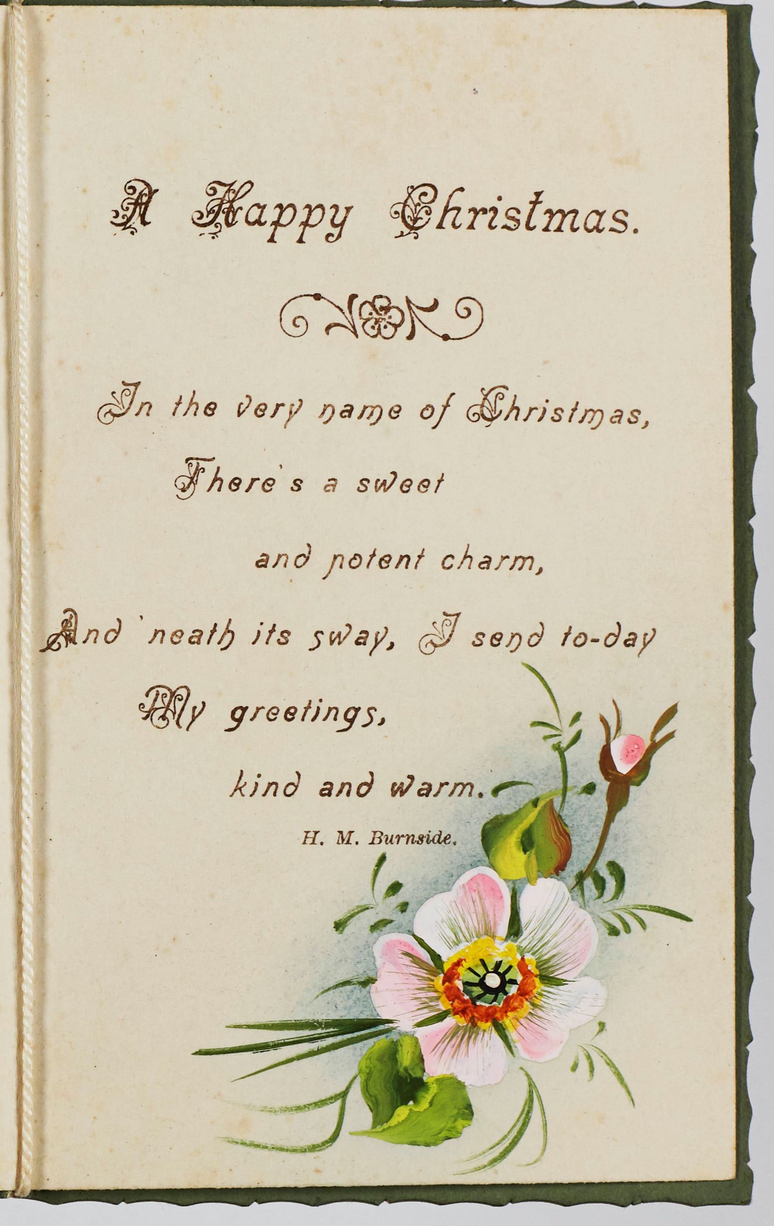 The styles and designs of those we hold range widely, though none are the typically late Victorian versions depicting a brightly coloured Santa Claus with toys or heavily laden Christmas trees. Our examples are nevertheless Christmas-themed – often featuring scenes and tokens we traditionally associate with Christmas card illustrations: snow, robins, cosy homesteads, holly and mistletoe. All contain sentimental verses, extolling friendship and bestowing seasonal good fortune on the recipient. Many also depict springtime flowers, regarded as an important symbol of renewed life after barren midwinter – a feature not evident on modern-day Christmas cards.