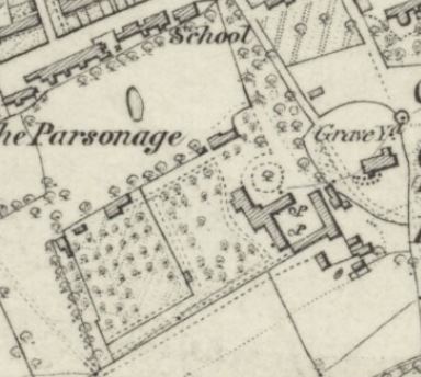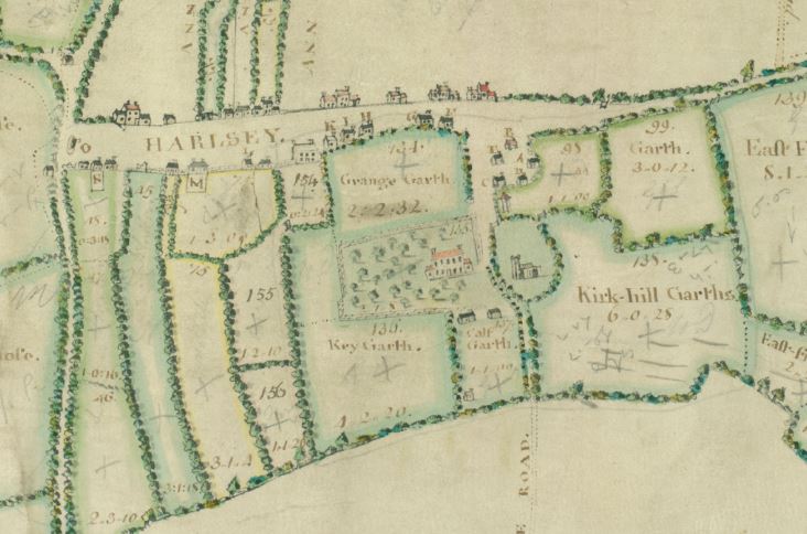 Right: Extract from 6” Ordnance Survey map of 1857 (Sheet 41) showing the orchard at Harlsey Hall, subsequently divided and enclosed by a wall