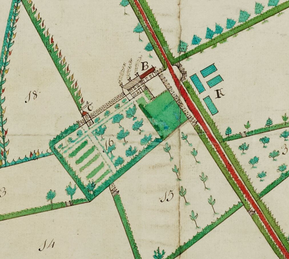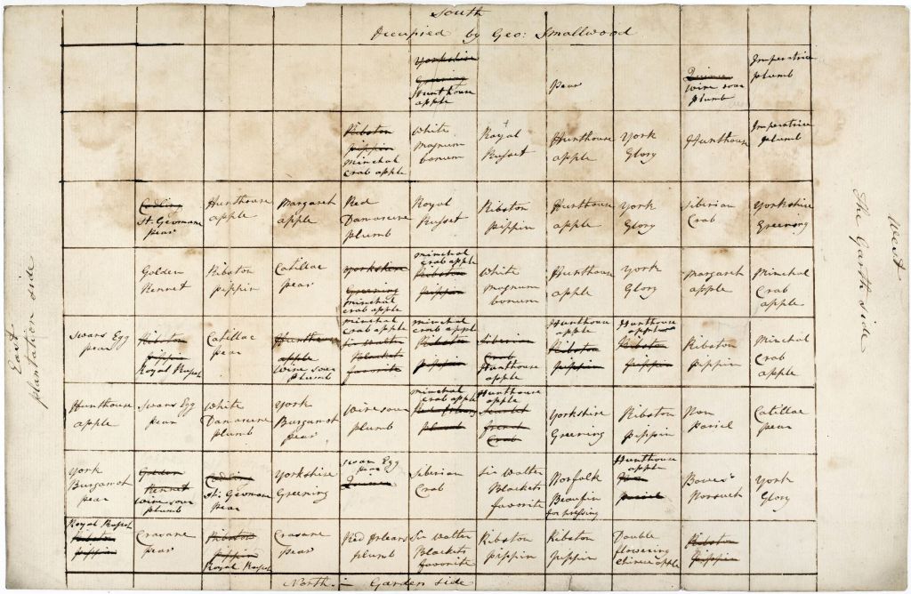 A plan of an orchard, possibly for Brockfield Hall, near Warthill, York, survives in the Agar family estate archive, dated 1804 [ZSG XIII 1/10]. This depicts a rectangular grid, 8 rows wide and 11 rows long. Each square contains the name of a variety of pear, plum, apple or crab apple, although some squares in the south-east corner are blank. In two squares, ‘Quince’ has been crossed out and replaced with different plum varieties. Two varieties of apple have also been crossed out and replaced: ‘Codling’ and ‘Ribston Pippin’, the latter in several squares. We are unsure of the reason, perhaps the varieties were unsuccessful in those locations, or maybe there was a change of plan?