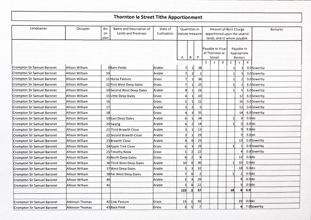 The following images show actual examples of the original Tithe Map and a page of the Tithe apportionment for Thornton le Street.