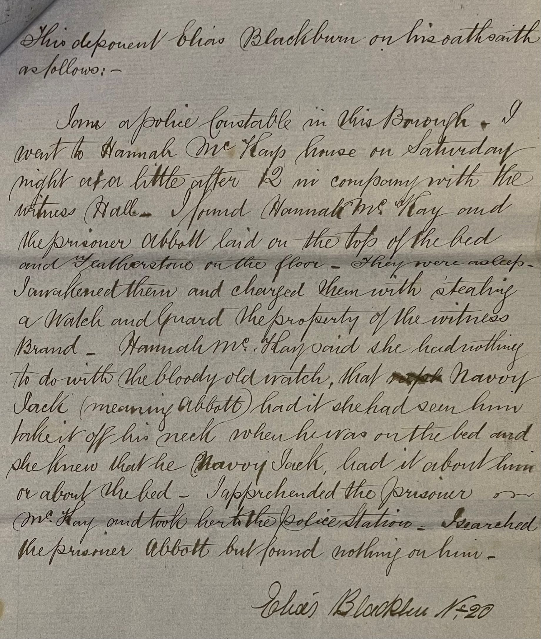 Abbott had tempted the victim to his home with a jug of beer. After falling asleep, the man awoke to find he had been robbed. McKay and Abbott pointed the finger at each other, Abbott threatening ‘You took it off his neck and if you don’t give it to him I’ll knock your head off with a poker!’ Hannah claimed to have ‘had nothing to do with the bloody old watch’, blaming ‘That Navvy, Jack’ (Abbott).