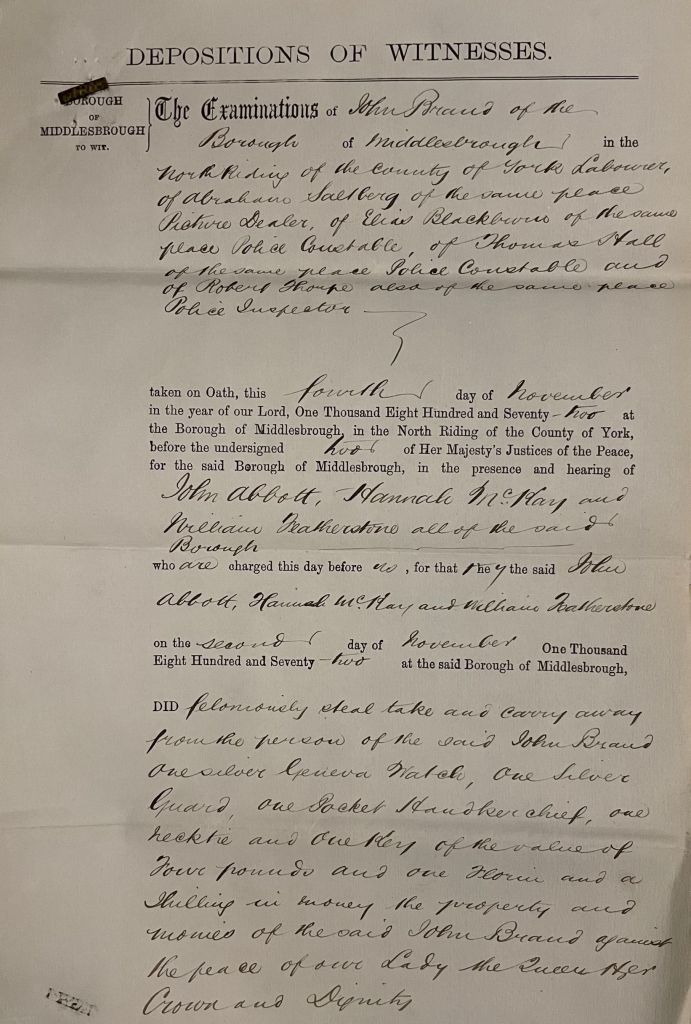 Hannah was from Staithes but by 1871 was living unmarried, with John Abbott, a labourer and their baby son in Middlesbrough. Abbott was indicted 1872 along with Hannah and William Featherstone, for stealing one silver watch, one silver guard, one pocket handkerchief, one necktie, one key, and 2s 6d in money, the property of John Brand.