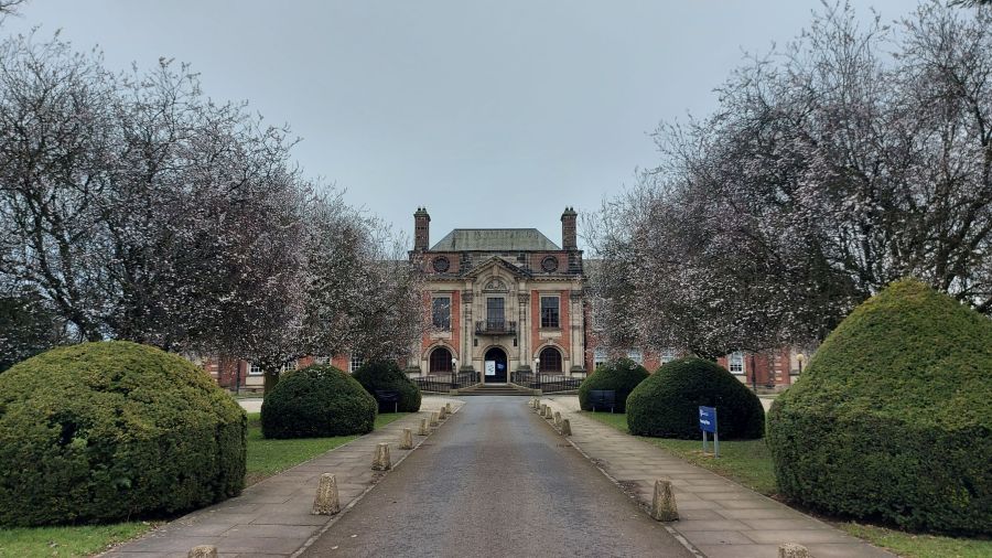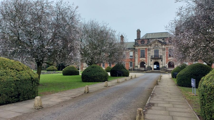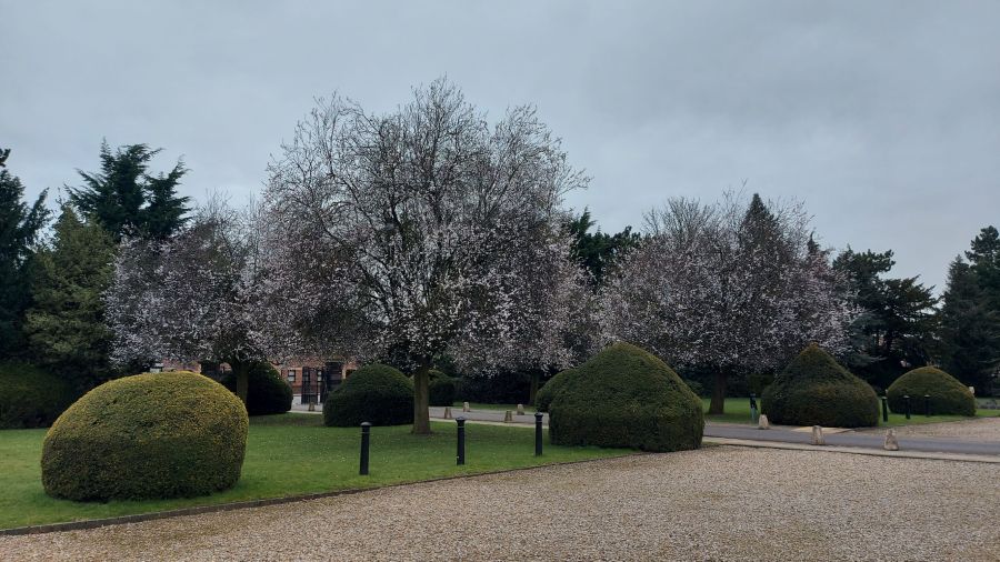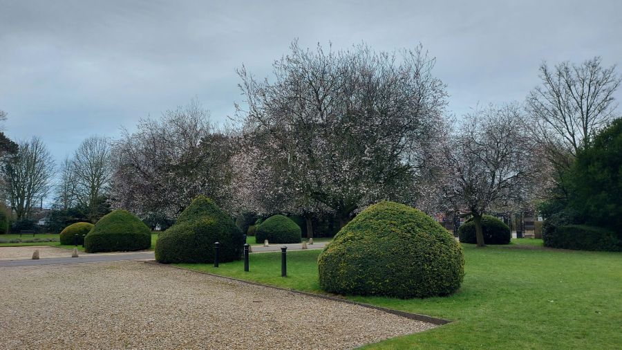 Clipped golden yews to the forecourt and sides of the driveway of County Hall, Northallerton, March 2021 (photos by G Falkingham)