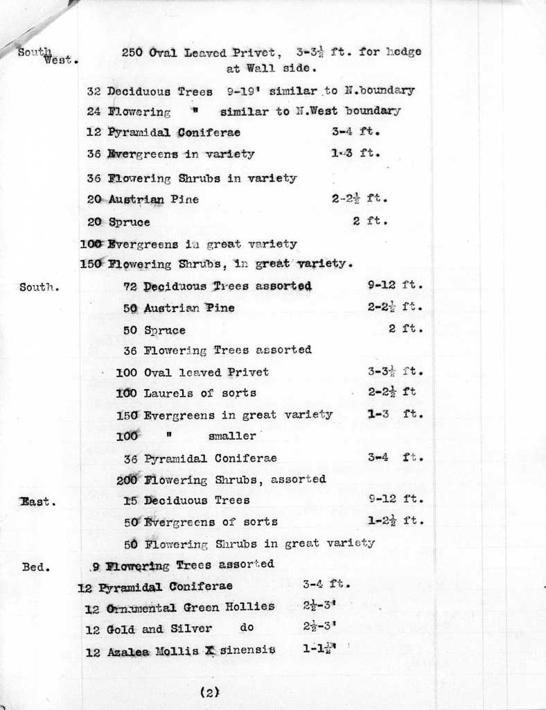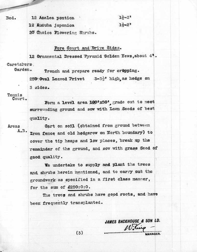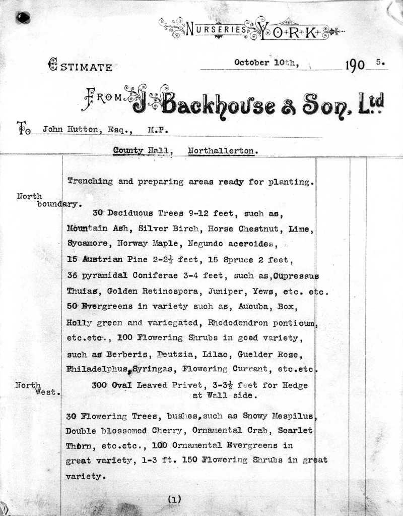 In the same period, we have a three-page estimate from Mr W King, manager of J Backhouse & Son Ltd, dated 10 October 1905 for the groundworks and planting around the newly built County Hall building, Northallerton (ZRA 49). This lists in detail the range of trees and shrubs which were to be planted ‘in a first class manner for the sum of £250’. They include 12 ornamental dressed pyramid golden yews for the forecourt and drive sides, which can still be seen today, somewhat larger than their original size of 4 feet! Also listed are oval-leaved privet for hedging, ornamental green hollies, rhododendron, Norway maple, horse chestnut and silver birch trees, and well as hundreds of assorted ‘flowering shrubs in great variety’.