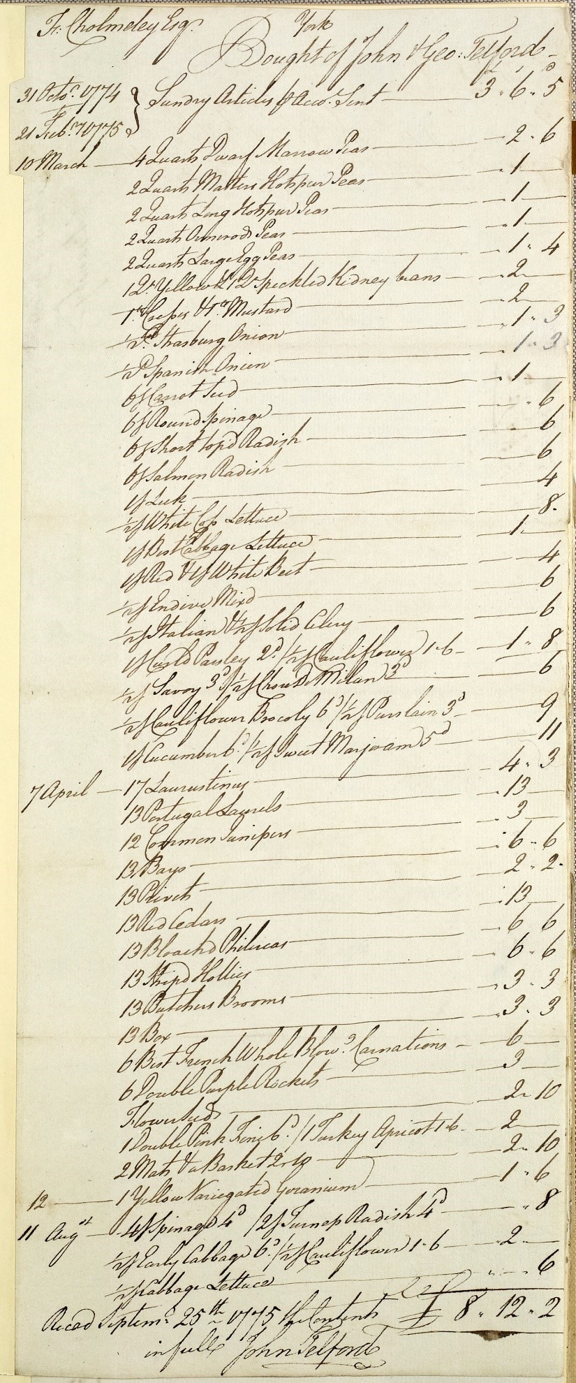 Amongst the collection of vouchers in the Cholmeley of Brandsby archive (ZQG), a Telford’s bill to Mr Cholmeley for 1775 provides a long list of seeds, trees and shrubs purchased by him that year. A grand total of £8 12s 2d was spent, equivalent to £741 in today’s money (thanks to the National Archives’ online currency converter).