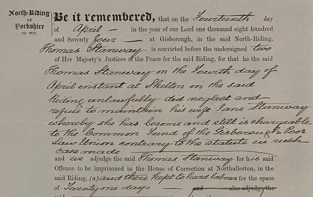 Be it remembered, that on the Fourteenth day of April 1874 at Gisborough, Thomas Stanway is convicted before the two undersigned of Her Majesty’s Justices of the Peace, for that he the said Thomas Stanway on the Fourth day of April instant at Skelton in the said Riding unlawfully did neglect and refuse to maintain his wife Jane Stanway whereby she has become and still is chargeable to the Common Fund of the Gisborough Poor Law Union contrary to the statute in such case made and we adjudge the said Thomas Stanway for his Offence to be imprisoned in the House of Correction at Northallerton, and there kept to hard labour for the space of Twenty one days.