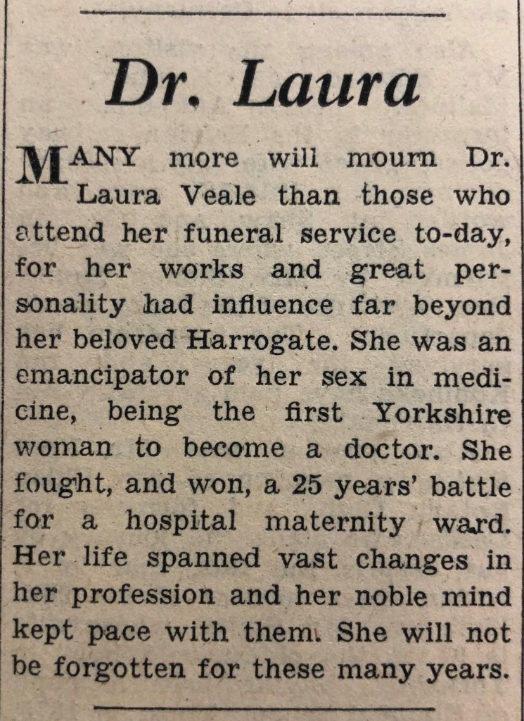Despite retiring from medicine in 1936, Dr Laura continued to make a difference where she lived. This included organising the Women’s Voluntary Service for Harrogate during the Second World War, and establishing infant welfare and antenatal clinics in Harrogate. Dr Laura Veale died on 14 August 1963, aged 95, at Scotton Bank Hospital. An obituary extract from the Harrogate Advertiser, dated 17 August 1963, can be seen below.
