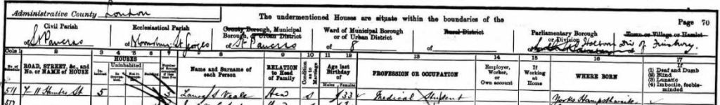 In the late 19th century, there was still a stigma, and a considerable amount of opposition to women entering medicine, which is made evident by Laura Veale’s rejection from Leeds medical school. Despite this, Laura did not give up on a medical career and was eventually accepted to study medicine at the University of London. The 1901 census records Laura S Veale as a 33 year old medical student at St Pancras.