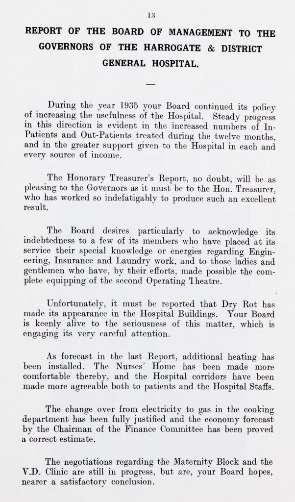 The images below show Dr Laura Veale’s name listed as a Consulting Obstetrician in the 1935 Harrogate Infirmary Annual Report, alongside a recognition that in 1935 plans to build a maternity department were being considered.