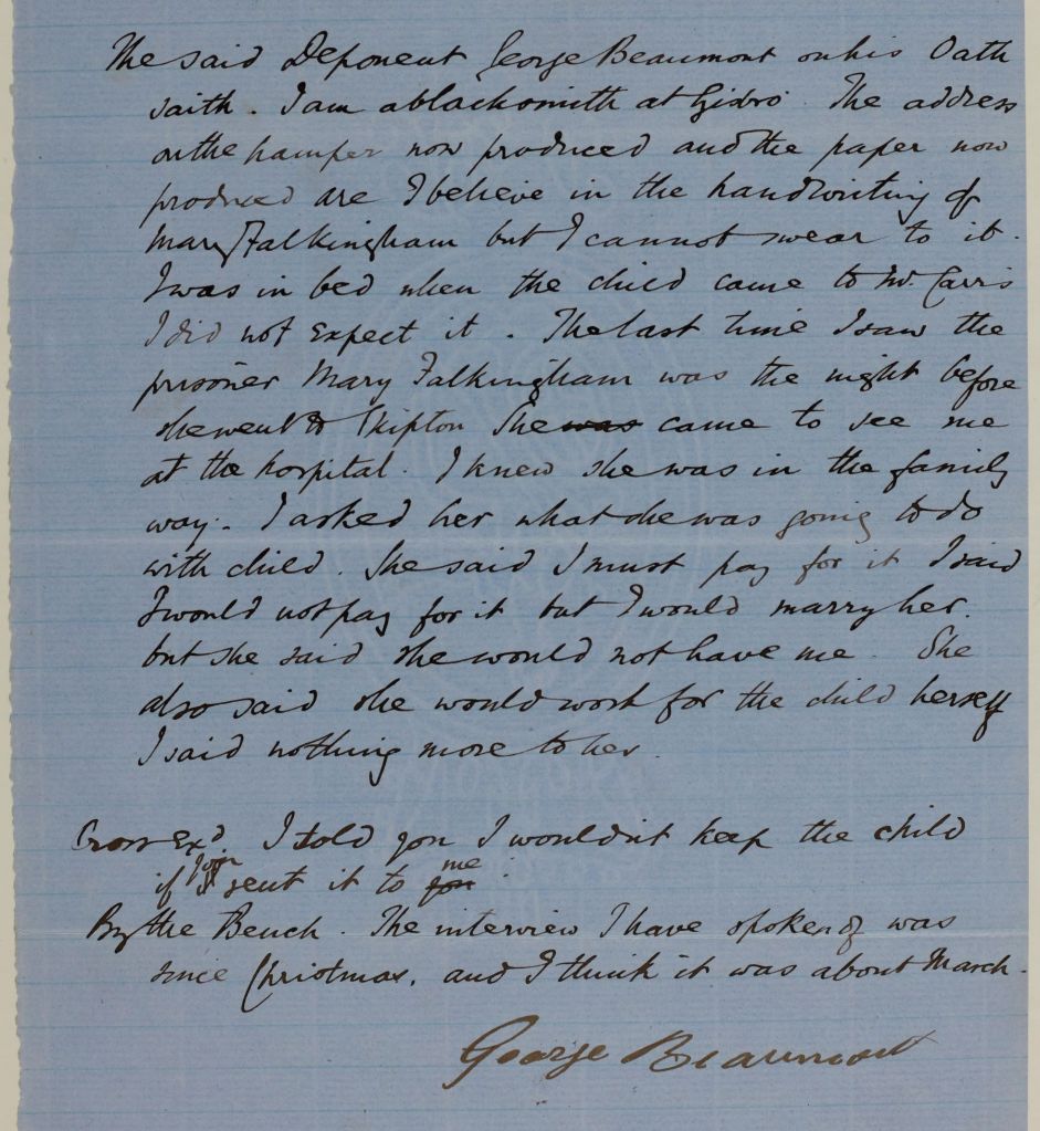 In her deposition, Mary Falkingham, who had given birth to the baby at the workhouse in Skipton, claimed that Beaumont, a blacksmith, had refused to pay for the child, but he had said that if they sent it to him, he would keep it. Beaumont denied this and declared that he had offered to marry Mary, but she refused the offer and demanded only that he pay for the child’s upkeep, as she would not work for it herself.