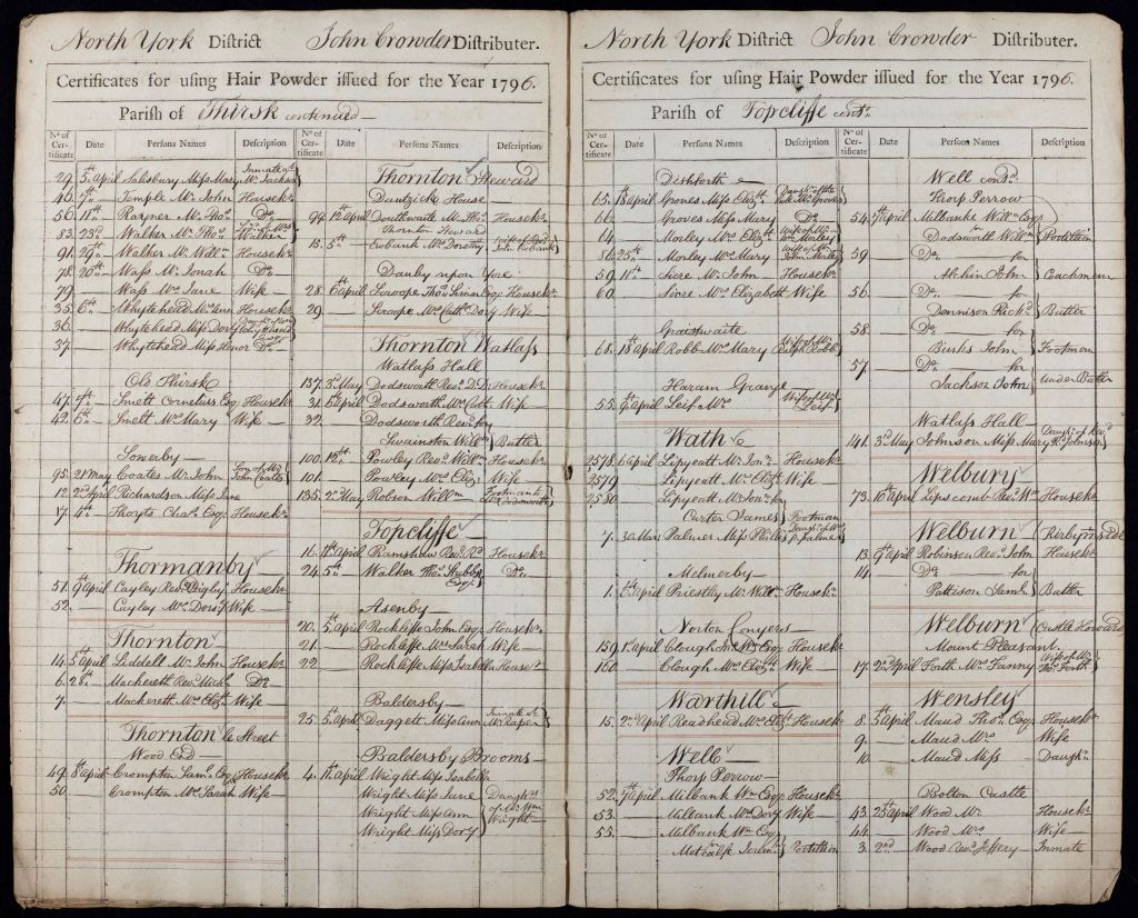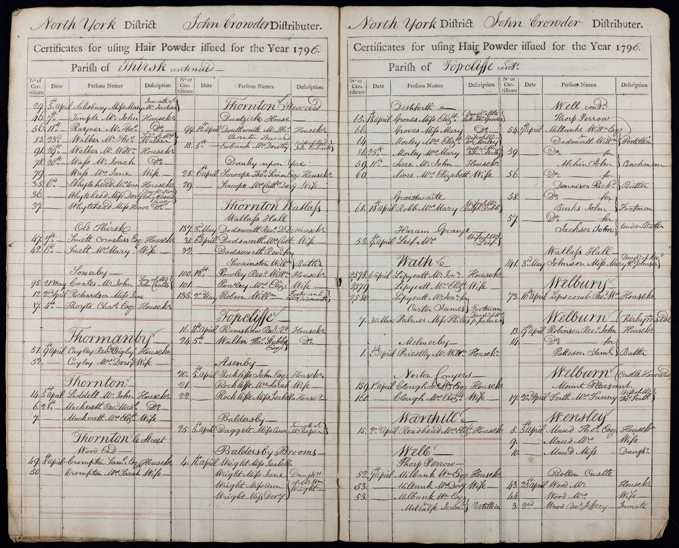 QDH register of hair powder tax certificates for Thirsk, 1796