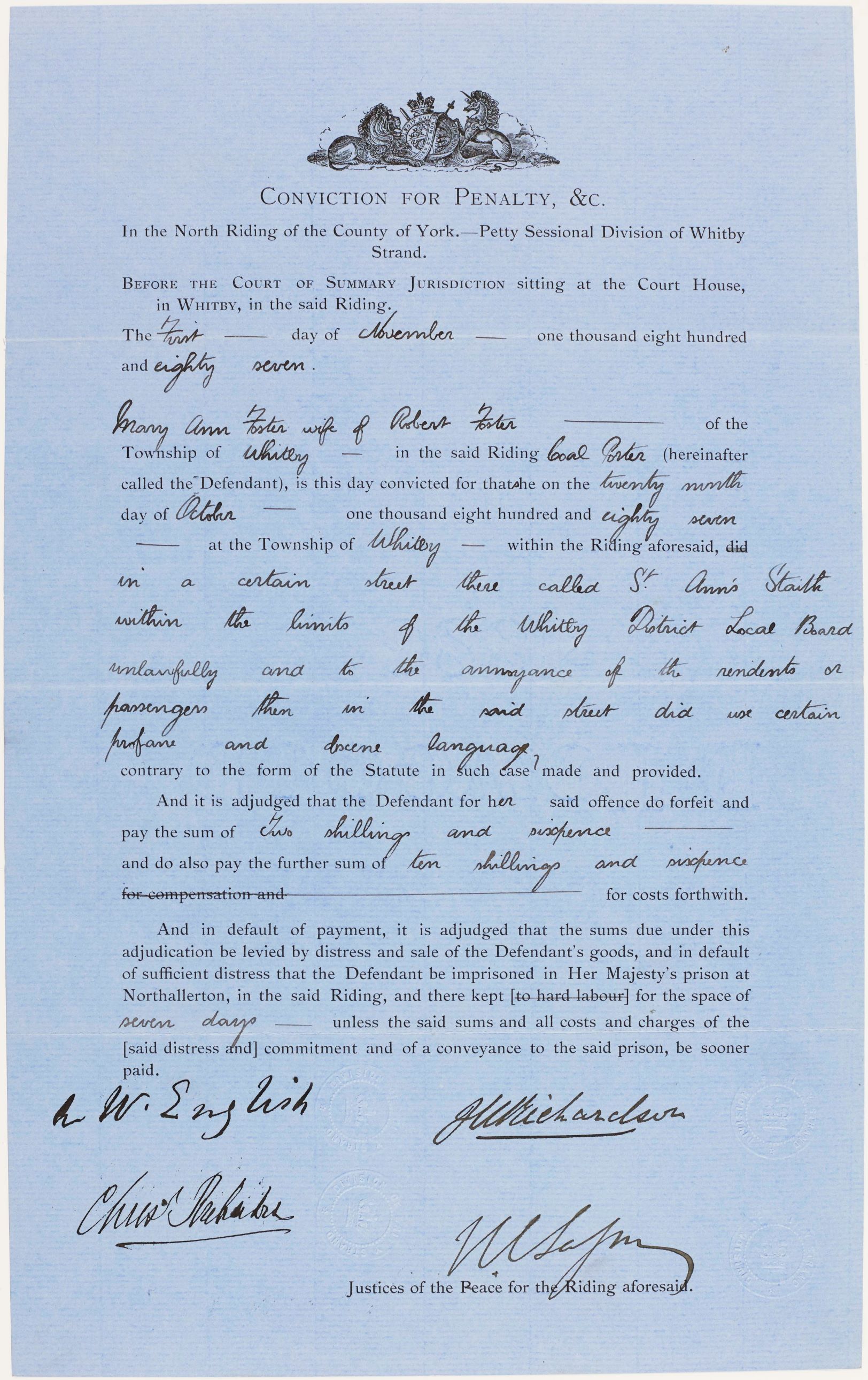 | QSB 1888 1/10/10/19 | Summary conviction of Mary Ann Foster wife of Robert Foster of the township of Whitby, coal porter, for using profane and obscene language in St Ann’s Staith Offence committed at the township of Whitby on 29 October 1887 Whitby Strand Petty Sessional division – case heard at Whitby |