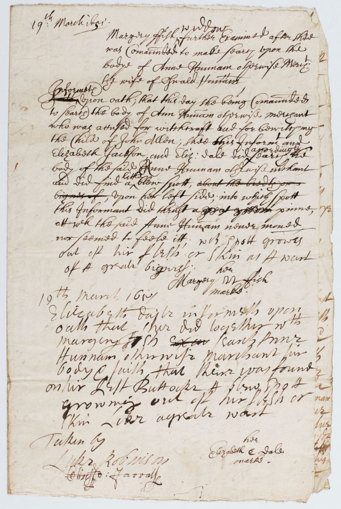 DC/SCB VI 4 Statements of Margery Fish & Elizabeth Dale in the case of Anne Hunnam’s witchcraft trial, 19 March 1652
