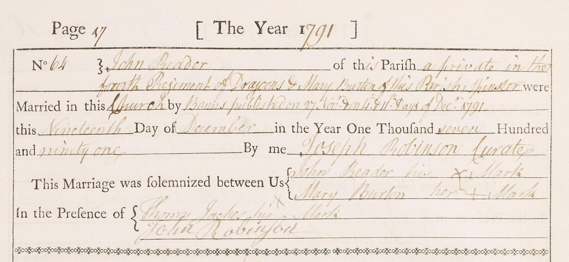 Perhaps the type of record people are most familiar with, parish marriage registers contain plenty of examples of these provided by some brides, grooms and/or their witnesses. The signing of marriage register entries did not begin until 1754, following Hardwick’s Marriage Act and the introduction of pre-printed registers, with the aim of preventing clandestine marriages. The wedding couple, plus two witnesses and the vicar himself all had to bear testimony.
